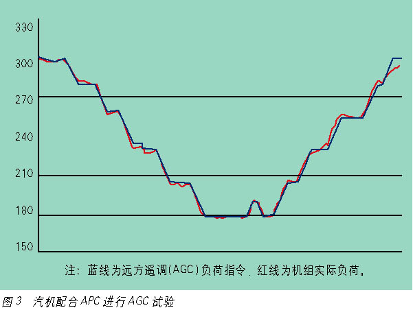 华能岳阳电厂二期扩建工程#3机组从调试到投入商业运行,经过多次开停机及168次运行考验,DEH系统运行情况良好,无一次由于系统自身故障造成机组跳机,在机组启动升速(见图2)、跨越临界转速、超速试验、并网升降负荷、变工况运行、抗扰动能力、一次调频、AGC控制(见图3)以及主调阀门活动等试验方面,都显示了系统的优越性,且具有运行安全可靠、在线检修维护、调试方便快捷等优点,达到了良好的效果。