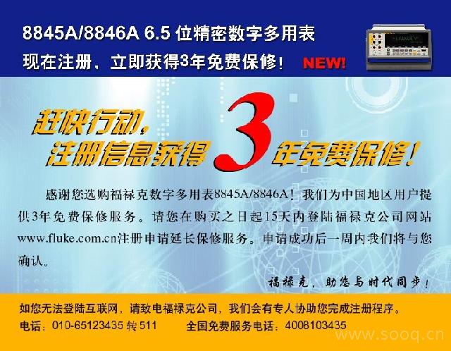 为更好地服务中国客户,福禄克精密测量仪器部将Fluke8845A/8846A在中国地区的保修期延长为三年。客户只需登陆福禄克中国网站并完成注册,即可轻松获得三年免费保修。