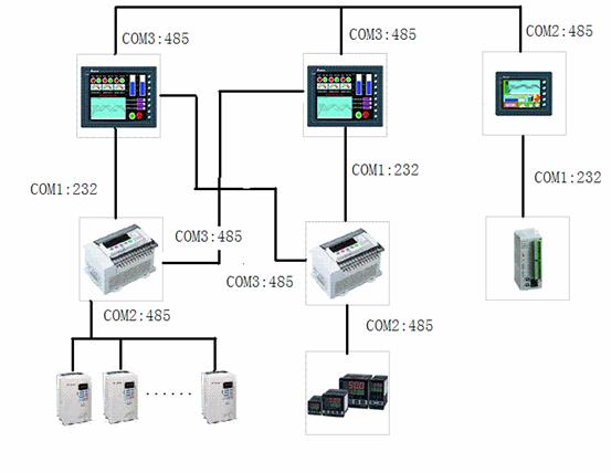 利用台达人机有一个非常的特点就是有三个通讯口且两个通讯口可以RS232、RS485、RS422进行随意配置,且每个通讯口都是互相独立的。这样就可以利用每一个人机的一个通讯口(此例中采用人机的COM3 设置为RS485通讯格式 7 E 1 9600)连接起来,进行通讯,主机通讯协议采用(MODBUS MASTER),而从机采用(MODBUS SLAVE)。而人机间数据的交换必须采用宏程序来实现。