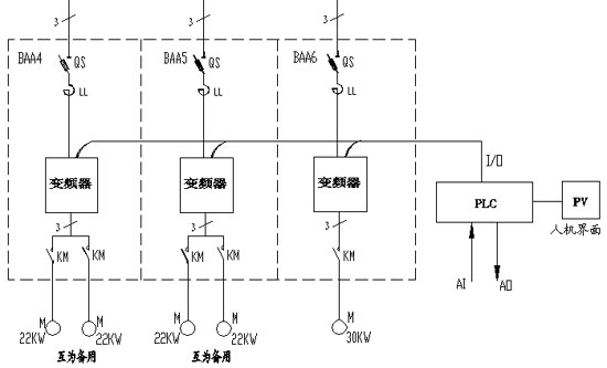 电机除变频控制外,可加旁路装置直联电网,变频器发生故障时,可切换到原控制系统上。变频器故障信号反馈到人机界面上。