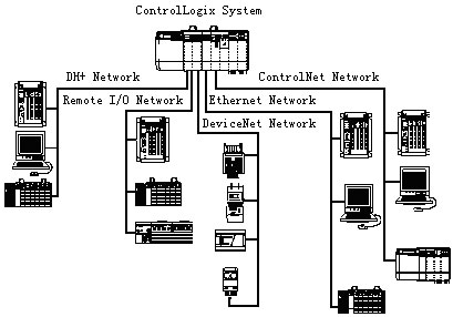 ControlLogix体系结构是目前非常先进的控制平台,该控制平台集成多种控制规程(如:时序、运动、驱动、过程)。它所应用的处理器核心为Logix5550。Logix5550具有强大的处理能力和灵活性,它支持一个ControlLogix机架上可以插入多个控制器、多个控制器可以穿越多个机架实现分布式控制、预定的处理器对处理器的通讯、多个处理器共享相同的I/O模块和通讯模块等众多功能。ControlLogix背板是一种无源的总线,采用的是流行的生产者/消费者技术,因此具有效率高、数据传送准确等优点;另外ControlLogix背板是一个网关级的模块,可以进行各层网络协议之间的转化,因此可以通过一个普通的网卡便可以访问其他各层网络。如图2.1为ControlLogix网络系统结构图。