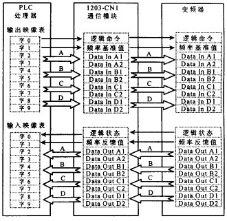 1203-CN1模块和变频器各有4个数据链A、B、C、D,每个数据链在处理器的输入和输出映像表中占用2个字,如A数据链在输入映像表中占用字2和字3。可通过通信模块的拨动开关来选通/截止某个数据链,如此,可通过数据链方式,PLC处理器每次可对变频器读或写2―8个字的数据信息。实际上数据链数据是要传送数据信息的指针。对于变频器来说,如要传送某个参数,则指针为该参数的参数号。所以必须在变频器中对各个数据链进行组态,即决定数据链指向哪个参数。