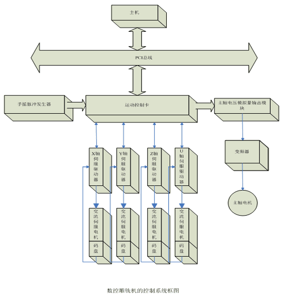 以PC机作为信息处理平台,运动控制卡以插卡形式嵌入PC机,即“PC十运动控制卡”的模式。下图1中所示为四轴数控雕铣机的控制系统结构框图。