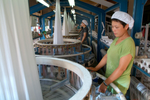 ▲南塑集团有限公司引进新型圆织机,电力消耗减少1/7,产品质量不断提高。