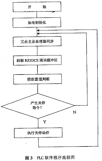 A-B PLC 5/40处理器随机提供6200系列编程软件,但在实际编程中采用了Rockwell软件公司的Logic 5软件对PLC进行编程。Logic 5是基于Windows的应用程序,相对于6200编程软件具有直观、易用、功能强大的特点。该软件运行于PC机上,通过RS 232串行口对PLC进行编程。由于程序复杂,故将程序分为若干个子程序进行编程。这些子程序块依次是,加电初始化模块、主从处理器同步模块、人机界面通信模块、模拟量高/低报警判断模块、Fire ESD/ESD/PSD/USD信号产生模块以及关停动作执行模块。经后来的系统调试实践证明,这种模块化的编程方式对安装调试提供了很大的方便,具体程序流程图如图3所示。