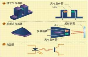 图1显示的是槽式光传感器开关,将一个发光二极管(LED)置于正对光电晶体管的塑料座中,发光二极管与光电晶体管之间有一个缝隙。如果物体穿过这个缝隙,它将阻断LED和光电晶体管之间的光路。槽式开关通过在发动机轴上放置一个开槽的轮子来检测发动机速度。当轴旋转时,它交替地阻断光路。槽式开关也用于指示门或罩的开关或闭合。当门是闭合的时候,门上的标志会落入槽内并阻断光路。