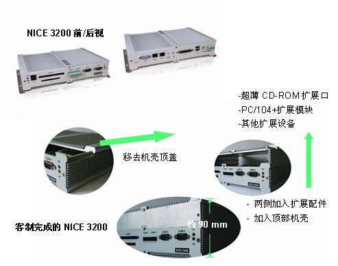 NICE 3200系列产品特殊的第二层系统扩展可依据你的需求便利的调整机壳高度,调换底板,加入扩展配件,如超薄CD-ROM扩展口,PC/104+扩展模块,以及其他扩展设备,客制为您自己的NICE产品。