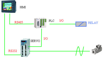 HMI 支持双通讯联机功能,可同时连接2种不同协议的控制器。本案使用HMI的COM2与PLC进行RS485通讯,用以设定PLC 程序中的按钮等元件,并可将PLC的运行状态反馈在HMI上,此外还使用了HMI的COM1与SERVO进行RS232通讯,用以与伺服内部寄存器交换数据,架构见可图2。