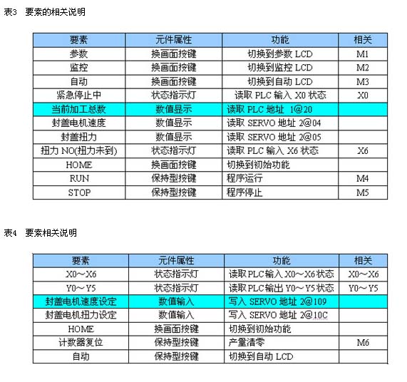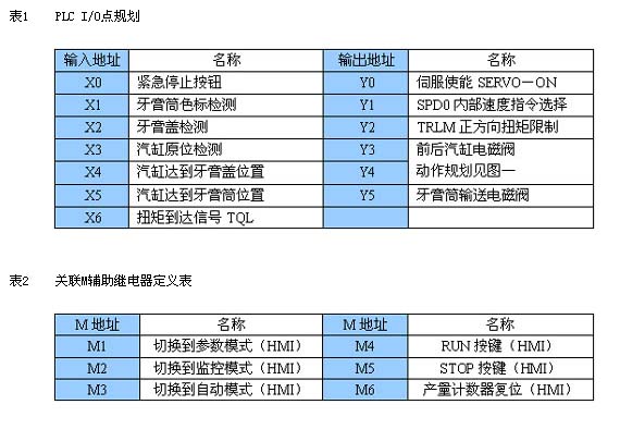 PLC I/O点规划如表1所示,PLC与HMI关联M辅助继电器定义如表2所示。