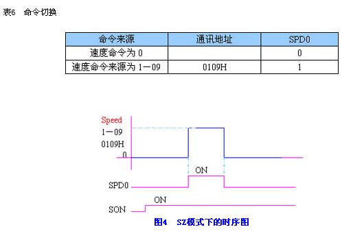 伺服速度模式主要应用于对机械速度精度要求比较高的场合。伺服单元有两种命令的输入模式,即外部模拟量输入(即S速度模式)和内部寄存器输入(即SZ 内部速度模式)。当选择SZ模式时,可以通过通讯的方式改变命令寄存器1-09(地址0109H)的内容值,并且还可通过伺服外部的DI -SPD0输入来切换命令,如表6所示,SZ模式下的时序图如图4所示。由上述可知,在内部速度模式下,只要改变伺服内部寄存器1-09的内容值, 即可改变伺服电机执行封盖的速度。