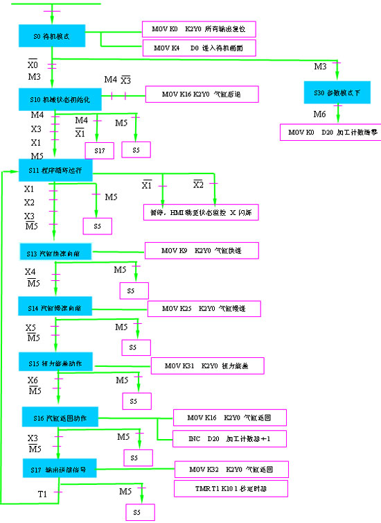 牙膏封盖机控制系统并不复杂,但是对工艺过程却有严格要求。根据生产线生产设备对工艺过程各个环节对工艺的具体要求,经过分析可以绘制出整个生产过程的程序动作流程图,如图6所示。按照该动作流程图编制出各子模块的相关程序并非难事,具体程序在此从略。