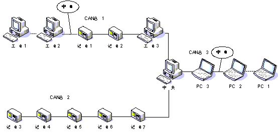 某炭素公司的主导产品为高功率圆柱型电极,主要生产流程包括中碎配料、糊料生产、挤压成型、电极石墨化、高压浸渍、环式炉或倒焰炉煅烧和成品机加等七道工序,另外还有一个煤气站用于给整个生产流程提供加热控制用热源。这些流程都有一台工控机或配备了具有RS485通讯接口和通讯功能的无纸记录仪。公司为了提高管理水平,确保电极质量,建立了一个基于CAN总线的全厂工艺参数自动监控系统。该系统以各流程处工控机和无纸记录仪为终端站,采集各流程的实时工艺参数,执行相应工艺过程控制;由中央监控机收集、存贮和集中显示各站点数据,建立全厂工艺参数数据库,完成工艺过程质量分析、统计、报表、打印等监测功能。同时,为了便于管理人员实时了解与掌握全厂生产和工艺变化情况,在主要管理员办公室配置了相应PC机终端,这类终端与中央监控机通讯,可实时显示各站点数据。网络系统组成示意如图1,各工控机和PC机通过CAN卡上网,无纸记录仪通过485/CAN智能转换卡上网。中央机和各站点工控机、PC机采用MCGS组态软件作为开发平台,开发相应的用户程序,通过OPC服务器软件实现CAN总线数据传输通讯。根据设备分布情况,该系统由三条CAN总线构成。