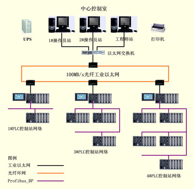 该水厂自控系统主网络采用了光纤环网。中央控制室、加氯加药控制站(1#PLC)、滤池控制站(3#PLC)、出水泵房控制站(4#PLC)组成了环形的光纤网络,这样保证了一旦在环形网络的任意点意外断开的情况下,不会影响系统通讯功能,同时又实现了对电气信号的隔离,避免了雷电信号、浪涌信号在网络间的传输。