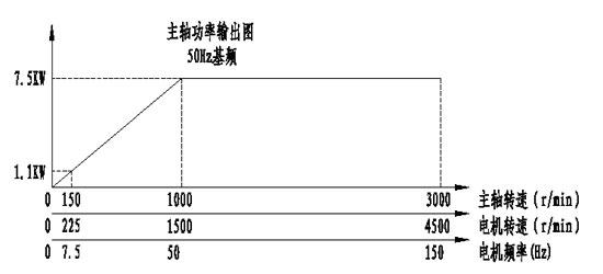 从上图可以看出,其主轴转速从0-3000转,1000r/min以下电机的输出功率随着转速的下降而下降,1000-3000r/min为恒功率输出,电机转速4500r/min,根据电机转速公式n=60f(1-s)/2p,所选电机为4极电机,在忽略转差率s的情况下,要求变频器输出的最高频率达150HZ。变频器在50HZ―150HZ之间为恒功率调速,在50HZ以下电机的输出功率成线性降低。
