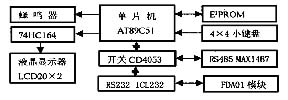 中央监控单元由单片机AT89C51担任,负责协调其他各单元的工作和与主机通信;指纹采集单元由FDA01模块担任[7,8],负责指纹原始图像的采集、存储和比对;人机交互单元由字符点阵式液晶显示器、蜂鸣器、16键小键盘组成;串行通信单元由RS232、RS485接口电路组成,完成单片机与FDA01的通信和单片机与系统主机的通信。由于AT89C51单片机的I/O口有限,为了充分利用其端口,AT89C51与FDA01模块、LCD显示器的数据传输均采用串行通信方式。AT89C51的P31/XD和P30/RXD引脚通过CMOS模拟开关CD4053切换,分别与RS232接口芯片ICL232和RS485接口芯片MAX1487相连。ICL232再与FDA01的RS232接口相连。AT89C51的P13 引脚与串并转换移位寄存器74HC164的B端相连,作为串行数据驱动口;P14引脚与74HC164 的CL K 端相连;P11、P12引脚直接控制LCD芯片的RS端和E端;74HC164 的并行数据端QA 2QH再与LCD芯片的D72-D0相连。