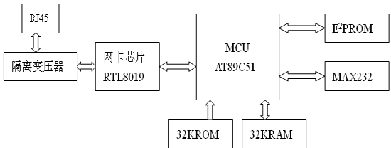 我们采用AT89C51单片机作为主处理器控制以太网卡芯片来实现和以太网的数据交换。由于单片机内存资源小,处理速度慢,则需要对单片机外扩RAM。这样,使用外扩RAM可以提高单片机的数据传输速度,以及处理复杂的TCP/IP协议。以太网数据包最大可以达到1500多字节,89C51单片机无法存储这么大的包,只有放到外部的RAM进行存储。同时外部RAM也用作串行口的输入输出缓冲,以使单片机可以高速的传输数据速度。
