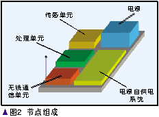 图1给出了一个典型的无线传感器网络的系统结构,包括分布式传感器节点(群)、接收发送器(Sink)、互联网(或卫星等)和任务管理界面等[1]。其中,传感器网络节点结构如图2所示,基本组成包括4个基本单元:传感单元(由传感器和模数转换功能模块组成)、处理单元(包括CPU、存储器和嵌入式操作系统等)、无线通信单元以及电源。另外,可以选择的其他功能单元有:电源自供电系统、定位系统等。