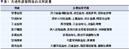 国内外研究机构纷纷开展无线传感器网络的研究,完全归功于其广阔的应用前景和对社会生活的巨大影响。表1总结归纳了无线传感器网络潜在的应用领域。