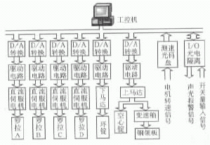 系统的驱动部分采用多电机分散驱动,各电机转速通过工控机D/A接口模块输出,由驱动电路带动直流伺服电动机,分别控制罗拉A、B、C、D和上、下马达。下马达控制环锭转动,上马达控制空心锭转速,并通过转速箱控制钢领板升降。各电机转速由测速光码盘反馈至工控机,然后由工控机完成调速任务,以确保锭子,罗拉,钢领板等传动系统的同步。各种开关量信号如启动、停车、钢领板上下限及各种保护信号经由I/O电隔离输入模块采集,各种异常报警信号由光电隔离模块输出,通过声光报警。