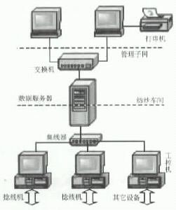 原有的捻线机控制系统只是单机运行,设备大量运行数据难以用于管理。在捻线机控制器成功改造的基础上,针对企业管理要求,我们将工控机控制系统与企业的计算机网络相连,将纺纱车间的计算机进行组网。如图3所示:纺纱车间共有两台捻线机,各由一台工控机控制,另配备一台工控机对车间的其它设备进行监控,各工控机将所有采集数据包括捻线机的设备状况、产量、品种、工艺参数、异常报警信息等数据实时转存于车间的数据库服务器。纺纱车间服务器通过交换机接入企业MIS网。