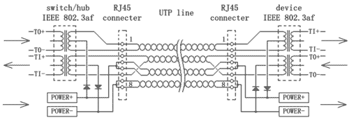 (4) 以太网的供电问题,多年来一直是一个缺陷,特别是随着IP电话、IP摄像机、无线AP、ENC(Ethernet Control System)等系统的应用,人们更提出以太网在传输数据的同时,传送部分能量,以满足小型网络设备用电的需求,解决小型网络设备供电的无序状态和居高不下的电源布线成本。因此IEEE 802.3af标准呼之即出,已形成一个以太网供电的国际标准,目前3COM、华为、DLINK等公司都有符合802.3af标准的交换机产品。IEEE 802.3af 标准的核心是在满足802.3 标准的同时,由交换机向网络终端设备提供48V或24V电源,至此工业以太网的供电问题得到很好的解决,其原理如图5所示。