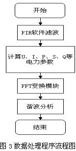 系统的软件由两个部分构成:DSP软件设计单元和上层监控软件设计单元。DSP主要用于判别按键、参数设置、数据采集、对采样量化的数据进行分析和计算以及通信控制等操作;上层监控单元提供友好的人机界面,便于参数的显示及控制,直观地、实时地反映当前电网的运行情况。本文中主要分析DSP软件设计单元。数据处理模块首先是对数据采集单元得到的离散化信号进行FIR滤波处理,后运用各种算法实现对各项电网参数的计算与分析。离散化信号经FFT变换后,以分离出基波分量和各次谐波分量,以便进行谐波分析。数据处理程序流程图如图3所示: