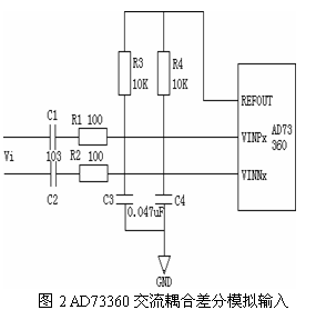 AD73360的模拟输入共有四种方式:直流耦合的差分输入、交流耦合的差分输入、直流耦合的单端输入和交流耦合的单端输入。交流耦合的差分输入的连接如图2所示,其中C1和C2起隔直作用,R1,C3和R2,C4分别为一阶低通滤波器,R3和R4的作用是把参考信号引入到输入端。