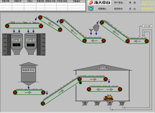 输煤系统各主要设备和辅助设备均纳入程序控制,并具有程序联锁保护。上位监控系统运行对整个输煤程控系统进行监视和控制,设给煤机、皮带机、碎煤机、煤仓等主要设备的动态显示画面,并按工艺流程动态显示设备运行状态、报警信息,历史趋势图显示设备运行历史趋势等。