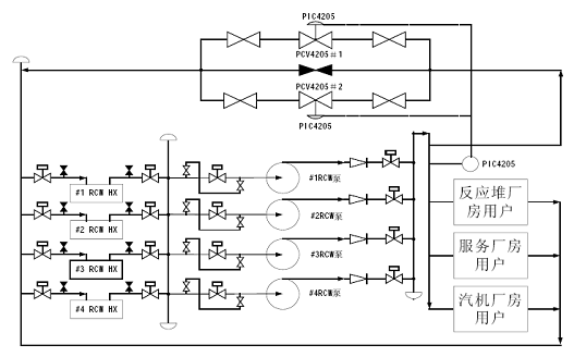 秦山三核RCW 系统是一个封闭式的除盐水冷却系统, 设计用来向核岛厂房、服务厂房和汽轮机厂房中由于水质或者压力要求而不适合用海水来冷却的用户提供冷却水,对设备进行冷却;RCW 系统共有4 台循环冷却水泵,泵出口压力约700kPa。在海水温度高于26℃时,4 台泵有3 台处于运行状态,1 台备用;此时2 台旁路阀门开度均为50 度左右。在海水温度低于26℃时,4 台泵有2 台处于运行状态,1 台泵备用,1 台泵停运;此时2 台旁路阀门开度均为30 度左右。冷却水在核电站是最重要的,是核安全的首要因素,使得堆芯在任何情况下都能保证足够的冷却,是核安全的根本。RCW失效将导致许多重要设备失去冷却水,进而导致核事故。因此该系统属于安全相关级系统,对机组安全可靠运行有着举足轻重的意义,即使在停堆大修期间,系统都必须保持运行。