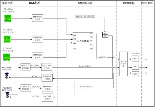 从控制逻辑上,我们要求DCS同时采集三台压力变送器的压力信号,而参与控制的压力值遵照一定的算法原则来选取,保证是最可靠的值。