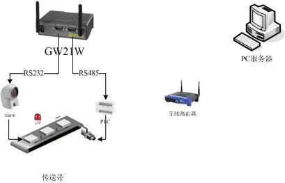 使用 GW21W后可通过无线网络与PC服务器相连,GW21W自带得2个串口同时连接条码扫描枪和控制传送带的PLC,现在条码扫描枪自动扫描物品条码信息,当条码错误时,PC服务器通过GW21W控制PLC使传送带停止,并发出警报。提示员工检查修正。通过无线网络使现场布线快速简单,降低了传输错误,提高工作效率。