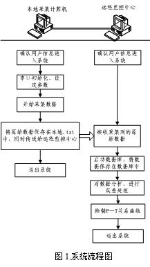 本系统由本地采集计算和远程监控中心构成一个C/S结构监控系统。在环境恶劣的工业现场,无法进行人为的实时监控,由硬件设备采集环境气象参数首先发送给本地计算机,然后传送给远程监控中心进行处理。本地采集计算机利用Visual C++ 6.0提供的Windows API实现对串口的操作。主要包括串口通信、设备控制、数据存储等模块,操作方便,人机界面简单清晰。在应用过程中,首先需要设定串口配置参数,如波特率、数据位、奇偶校验等,串口初始化后,程序开始运行,采集到的数据同时被保存在扩展名为.txt文件中。然后通过Socket的通信方式把采集到的数据传送给远程监控中心,由它来进行数据在数据库中的存储,以及数据平滑滤波处理,并绘制出P—T曲线。整个系统实现流程如图1所示。