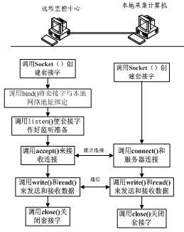 当工业现场环境恶劣,不适合人为操作时,将硬件采集的数据传送到远程监控中心进行分析和处理是十分有必要的。Socket套接字是目前最流行的网络通信应用程序接口之一,利用它可以方便地实现局域网内的数据的传输,是开发客户机/服务器网络应用程序的重要方法。当向一个套接字写入时,所送数据会自动出现在套接宇的另一端,另一端可能是相同机器上运行的另一个进程,也可能是世界上任何地方互连的一台计算机。TCP/IP传输层有两个并列的协议:T C P ( Transport Contro1 Protocol)和UDP(User Datagram Protocol)其中TCP是面向连接的,UDP是无连接的,Socket同时支持这两种通信模式,所对应的Socket分别为数据流Socket和数据报Socket。数抓流Socket定义了一种可靠的面向连接的服务,实现无差错、无重复的顺序数据传输;数据报Socket定义了一个无连接的服务,数据通过相互独立的包进行传输,包的传输是无序,并且不保证是否出错、丢失和重复。本文采用了流式Socket来实现远程数据传输,工作过程如图4所示。