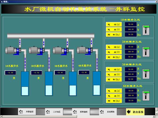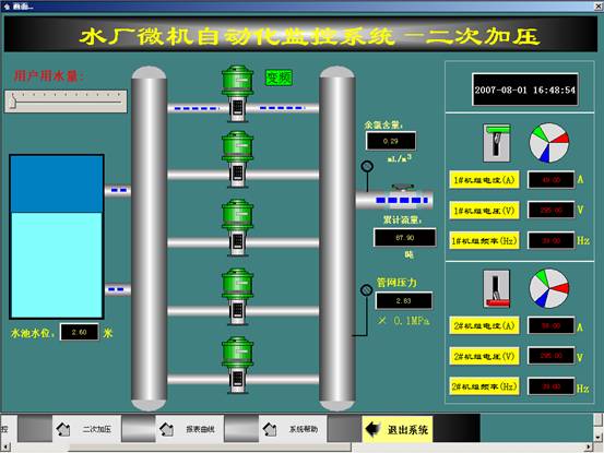 水厂自动化监控特点:一般是C/S结构;现场客户多数技术水平一般,或者只是一般操作工人;对计算机应用感到陌生,而相关上级管理人员却要求水厂的自动化程度尽可能高、自动化水平尽可能靠近国内一流;从工程建设管理角度,项目建设必须要有生命期――完工日期,也就是说,公司不可能无限期地安排技术人员进驻施工现场。为解决上述问题,硬件上选择先进的设备、仪表自不必说,软件上选择组态软件开发可视化强、应用简单的二次界面就成为必然,要求组态软件可靠性、稳定性必须强,否则将给用户增加更大的维护成本。