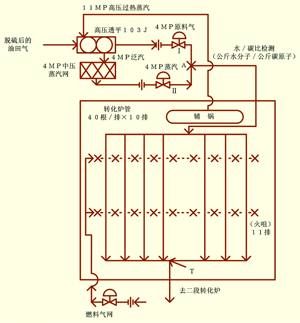 工艺流程大致如下:脱硫后的油田气经高压透平压缩机升压至4.0MP后在汇合点与来自4.0MP的蒸汽管网的中压蒸汽按要求的比例(水/碳比值)汇合后进入转化炉管(排)。每根转化炉管的内径约12cm,长度15米,系特种高质合金钢铸成。每根转化炉管内均装填有催化剂,形成直柱式固定床反应器。每排有40根炉管,共有10排计400根炉管,共有11排火咀燃烧供热,两排火咀夹一排炉管;中间的每排火咀系顶、底两排,火苗中心在顶层下(底上)的5米左右,全是人工手动(阀)调节。为充分利用热量,一段转化炉内(顶)有一辅助锅炉产生11MP的高压蒸汽驱动高压透平压缩机101J~103J(原料气压缩机),其泛汽供4.0MP左右的中压蒸汽管网作全厂能源网之一,驱动泵、一段炉的原料之一的供汽(约占全厂用汽的1/3)以及尿素用汽(占总量的1/3)。这种蒸汽自产(半)自用的状况构成了装置内部的正反馈[8](因为按照物料衡算与热量衡算,负荷量(油田气kNm3/h)变化是作为出口温度(串级)系统内环的燃料流量控制回路的前馈量予以引入的,当负荷量减小时其供热量也相应减少而致产汽量也随之减少!)。