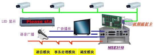 该系统由无风扇嵌入式工业计算机新汉NISE 3110和视频捕捉卡,通信模块,数据库访问模块,多媒体播放模块,事务处理与调度模块组成,系统负责数据的采集、分类、处理和显示,并将所采集的数据通过网络设备发送给服务器做存储。