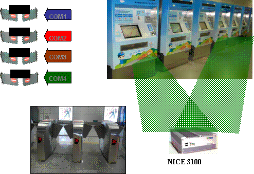 由自动售票机,自动增值机,自动兑币机,自动验票闸道机,在自动检票闸机系统中,需要多串口应用,例如车票自动吞吐口、非接触式IC卡、用于显示提示信息的显示频、阻挡装置控制器、中心控制器、报警器等等,同时需要网口、USB接口与系统终端进行信息通讯。NICE 3100控制主机及其他辅助连接设备组成。