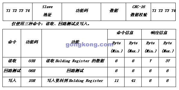 在MODBUS RTU 模式的通讯协议中,一个信息(Message)乃由4 个部份组成:Slave 地址、功能码、数据及CRC-16数据校验,并依序送出。每一个信息的开始与结束,皆以3.5个字符(Character)的间隔时间来做识别。