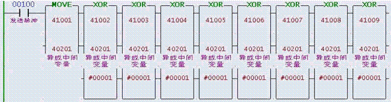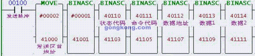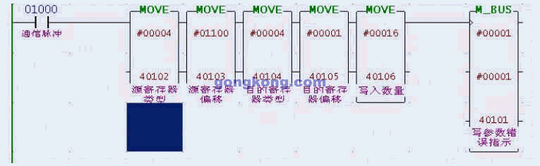 假设东元变频器上的设备地址为1,上图的程序完成了这样一种功能:把PLC内部41100~41115变量的内容,写到东元变频器寄存器区域偏移为00~015的连续16个寄存器里去,中间继电器01000每次从0变为1,双方通信一次。当然在之前要对PLC进行一下参数设置,具体可参见V80PLC的软件手册。