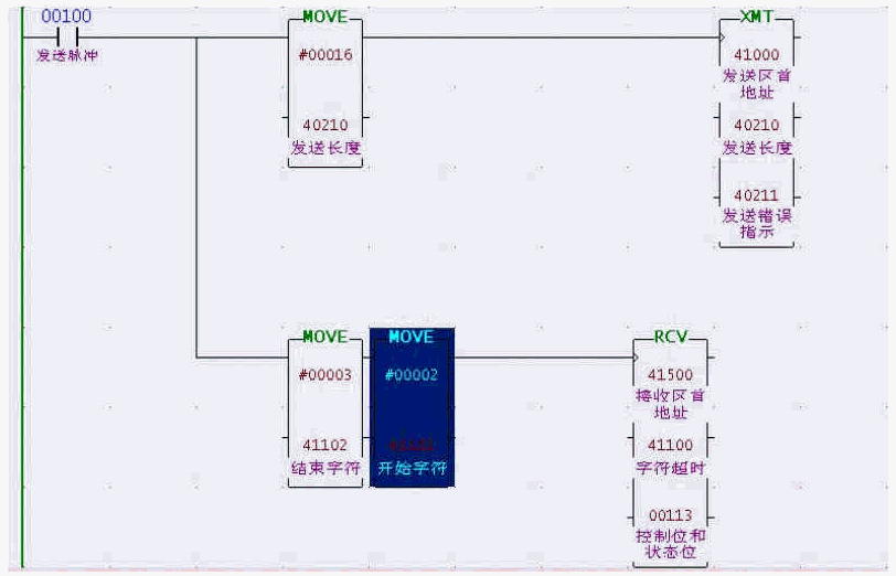 发送程序比较简单,只需填一个发送长度即可,而接收的情况则要复杂一点(图里没有体现出来)。在发送的同时就打开接收,使能开始字符和结束字符(通过设置控制位,这里没画出来),并把开始字符和结束字符填好,还有一些超时时间之类的设置(有兴趣的可以参见V80PLC的软件手册),这样当接收到“02H”就认为是一帧的开始,接收到“03H”就认为是一帧的结束,当然也可以结合其它条件,如字符超时等,各种状态都可以在状态位里体现。