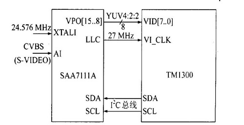 视频编码单元以TM1300 (1) 为核心,外围器件包括EEPROM , 16M SDRAM , 视频AD芯片SAA7111A ,双口RAM 和16MB FLASH. 其中,SAA7111A 是Philips的增强型视频输入处理器( EVIP) , 输入的模拟视频信号可以是CVBS(PAL ,NTSC 等) 和S-Video ( Y/C) ,A/ D 转换后输出符合CCIR-656 的YUV4∶2∶2 数字视频信号.视频输入原理图如图2 所示,SAA7111A 的YUV数字视频输出端口和TM1300 的视频输入端口(VI) 相连接, SAA7111A 的工作方式由TM1300通过I2C 总线进行配置.