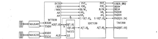 外围扩展单元原理图如图4 所示, 以WINBOND公司的具有两个串口的单片机W77E58 为核心, 扩展IDT7130 双口RAM ,MAX232 和MAX485. W77E58 通过串口0 根据RS-485 接口标准实现对摄像头及云台的控制,通过串口1 传送RS-232 透明数据 . W77E58 和TM1300 (1) 之间通过自定简单协议对双口RAM进行存取,从而相互传递控制信息和数据. 外围扩展单元的功能是通过对W77E58 编程来实现的,为了提高程序运行的可靠性,在我们的单片机程序开发中还使用了看门狗定时器.