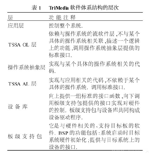 TSSA( TriMedia Software St ream Arc2hitecture) 是由应用层模块(Application) 与若干功能模块(Component ) 组成的建立在数据包交换上的一种流结构. 沿用了COM 技术中软组件对象(Software Component) 交互的思想,提出了对多媒体数据流进行处理的一种组件对象模型 . 其中应用层模块负责系统的初始化, 采用软件流体系结构可以大大简化多媒体应用开发. TSSA 体系分为以下几层(见表1) :