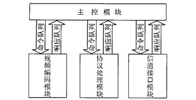 编码器软件组成结构如图5 示(不包括单片机编程部分) . 主控模块相当于TSSA 中的应用层模块,负责创建、运行视频编码模块、协议处理模块和信道接口模块,并通过响应队列与命令队列在各功能模块之间转发控制与状态消息. 视频编码模块实现遵循H.263 协议的视频压缩编码 ;协议处理模块实现H.323 协议栈 ;信道接口模块实现将数据报封装成MAC 帧送上具体的物理信道. 各个功能模块之间通过双向消息队列交换数据.