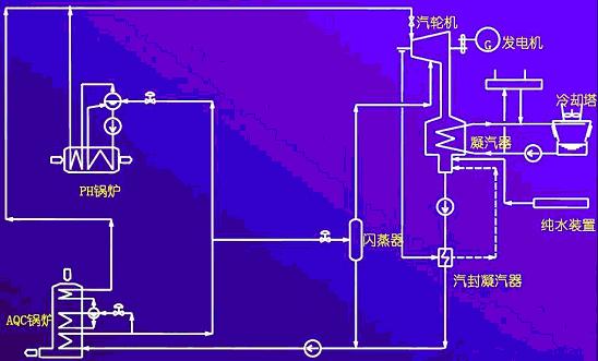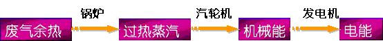 纯低温余热发电技术即在新型干法生产线生产过程中,通过余热回收装置——余热锅炉将水泥窑窑头、窑尾排出大量低品位的废气余热进行回收换热,产生过热蒸气推动汽轮机实现热能——机械能的转换,再带动发电机发出电能,并供给水泥生产过程中的用电负荷。