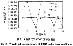 对FBG1和FBG2的反射谱连续测量10次,FBG1和FBG2自由放置,温度保持不变,所以,理论上各次的结果应该相同,但实际中存在微小的差异。图2是在1 552~1 557nm范围内,采样800点,FBG2在3种不同情况下的测量值(FBG1与FBG2类似)。