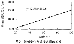 每次以10℃的步长逐步对FBG进行加温,插值-相关谱法测得Bragg波长变化和温度之间的关系如图3。