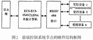 该前端控制系统节点的硬件结构由4 部分组成: 研样ECL -1541CLDNA 单板计算机、以太网、RS232/485 总线、受控设备, 其中受控设备由大量带有标准串行设备接口的工业仪表组成, 其组成结构如图2 所示。