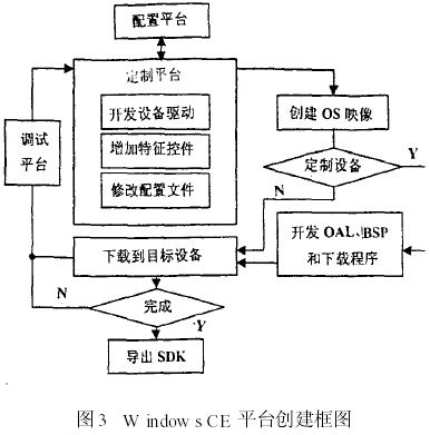 创建基于WindowsCE 的应用程序, 首先要搭建一个WindowsCE 平台, 即根据目前设备的硬件组成的WindowsCE 进行定制, 安装或创建设备驱动, 生成一个基于目标设备硬件配置的操作系统映像文件, 通过网卡、串口或并口将映像文件下载到目标设备的硬件平台中.WindowsCE 平台创建过程见图3。