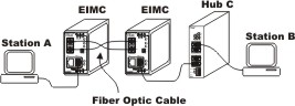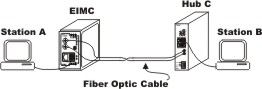 In transparent mode, two EIMCs are connected back-to-back using a fiber optic cable and their DIP switches are set to transparent mode. All other connections are made to copper ports. Hub C can be either a repeating hub or a switching hub. Assume either the hub or the switch is not capable of auto-negotiating. Then the hub and station A will default to 10 Mbps and half-duplex operation. In this case an EIMC-10T/F could be used although an EIMC-100T/F would work equally well. However, if both station A